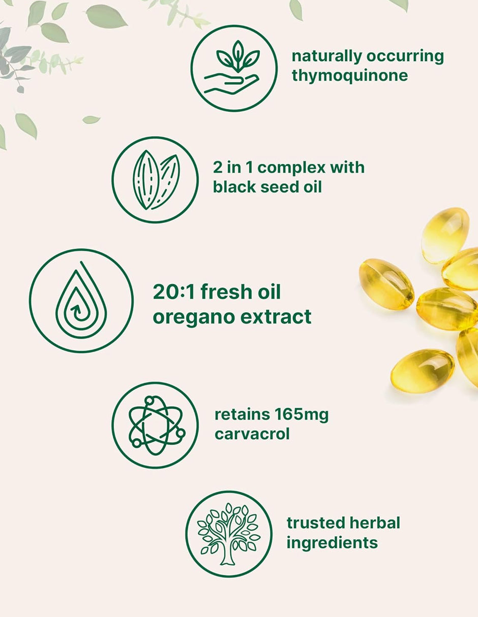 Descubre la fuerza de la naturaleza en cada porción con este complejo de aceite fresco de orégano extraído de hojas de Origanum minutiflorum y aceite de semilla negra de Nigella sativa. Cada dosis de dos cápsulas blandas combina 165 mg de carvacrol natural y 200 mg de aceite de semilla negra, brindando un potente apoyo herbal para la salud inmune y el bienestar general.